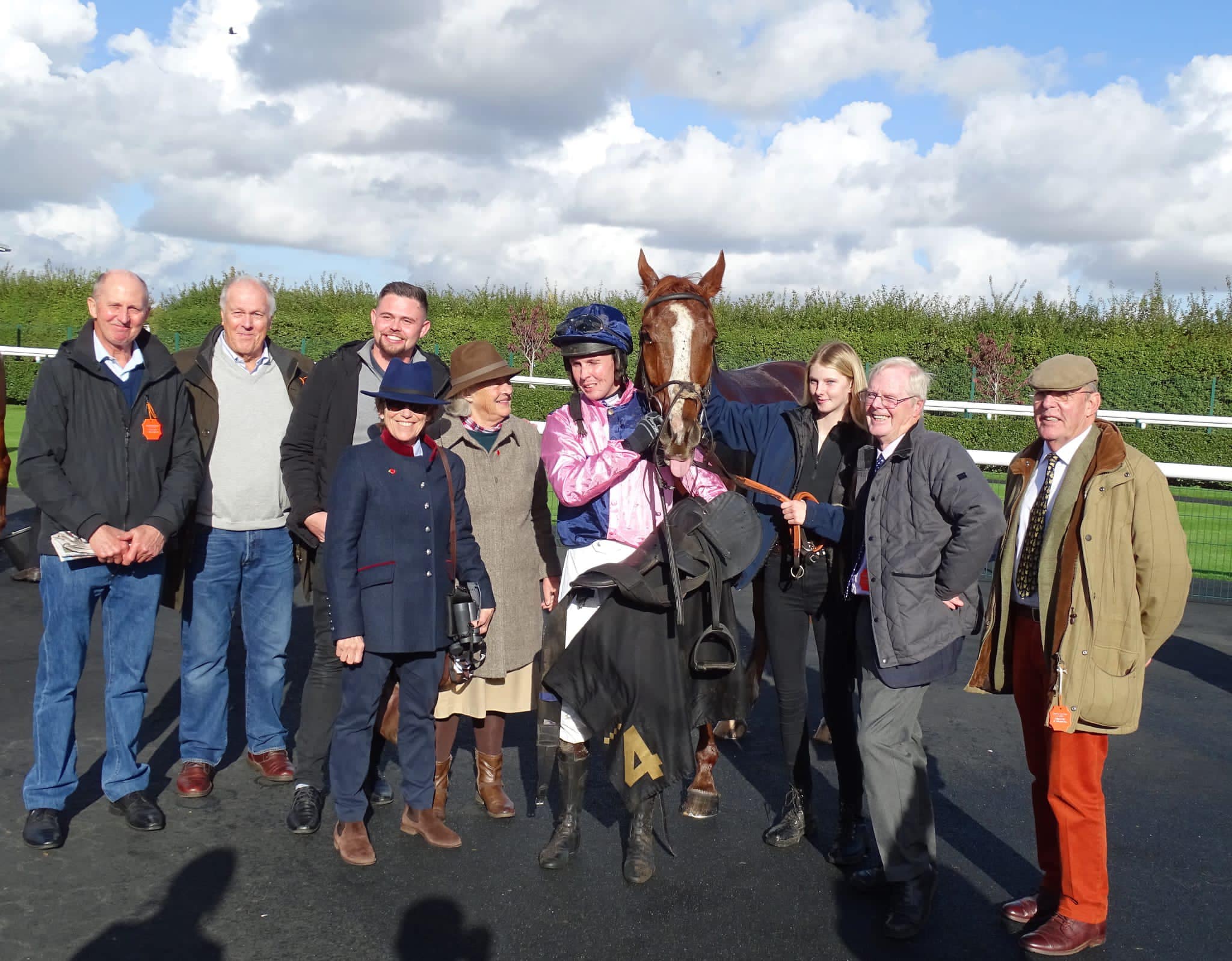 Kankin made a superb start over fences winning on his seasonal debut at Huntingdon. A great start for his new owners The 25 Club who purchased him at the end of last season. A very slick round of jumping with Kielan on board and hopefully lots more fun to come this season. So good that so many of the club could be there to welcome him home and pick up the trophy.